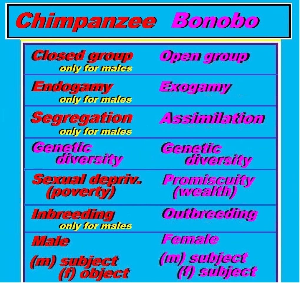 Unlike nowadays chimps, bonobos developed somewhat like our ancestors, the bipedal australopiths with their roaming culture through the savannas. Bonobos also developed a different sexual culture with a different religion. But since they did not develop inbreeding, hominini and bonobos developed in different directions. Only in the end the sexual culture of bonobos matches again with Western culture.