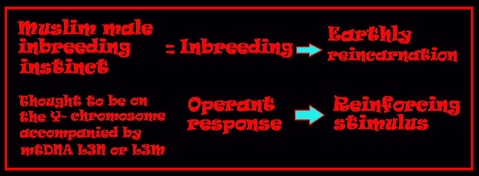 Assumption 336: The inbreeding instinct is a human instinct developed somewhere between Homo erectus (2 Ma; 900cc) and the Arabian Peninsula (Homo sapiens, 60-50 ka; 1400cc). It is a typical male instinct which aims at earthly reincarnation into tribal inbred bodies enforced by cousin marriages. It is still vividly present in the Muslim culture.